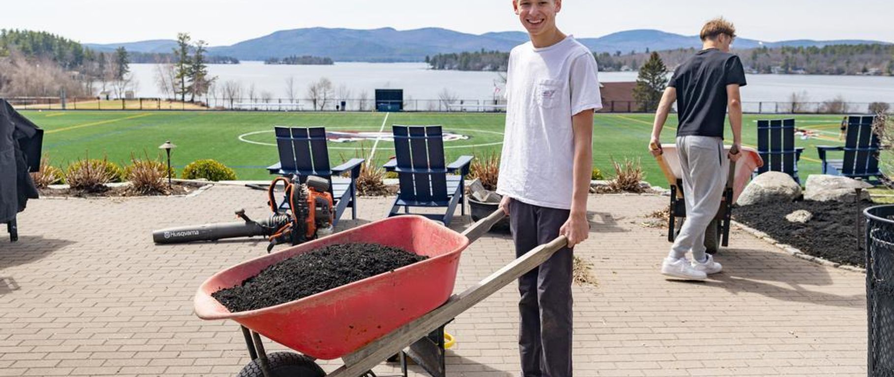 Through an initiative led by Team Palmer, a handful of community members gave up part of their free day to re-mulch the terrace. No requirement, no special recognition. Just people who showed up because they understood what the space represents. Will Brochu '26 coordinated donated mulch and supplies through Brochu Nursery and Landscaping before the work even began. Anelya Caesar '27, a junior student leader, organized and ran the project from start to finish. Faculty members TJ Palmer and Alicia Wingard were right there alongside them, shovels in hand, happy to get a little dirty.