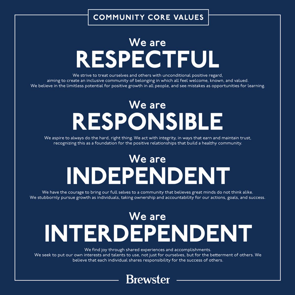The way we engage each other as community members is a reflection of what we value. Here, we often cite the mantra, “Brewster will be better because of me and I will be better because of Brewster.” This is the foundation of our four community core values: respect, responsibility, independence, and interdependence.