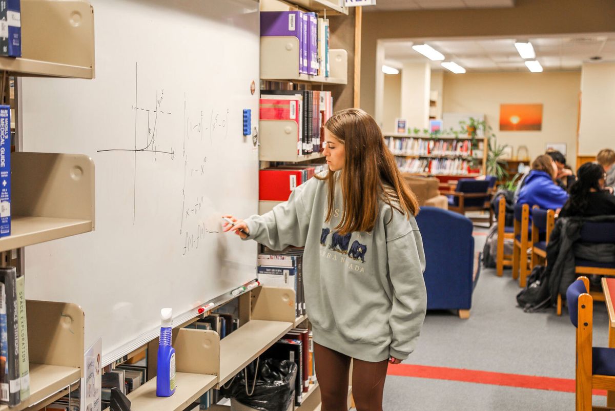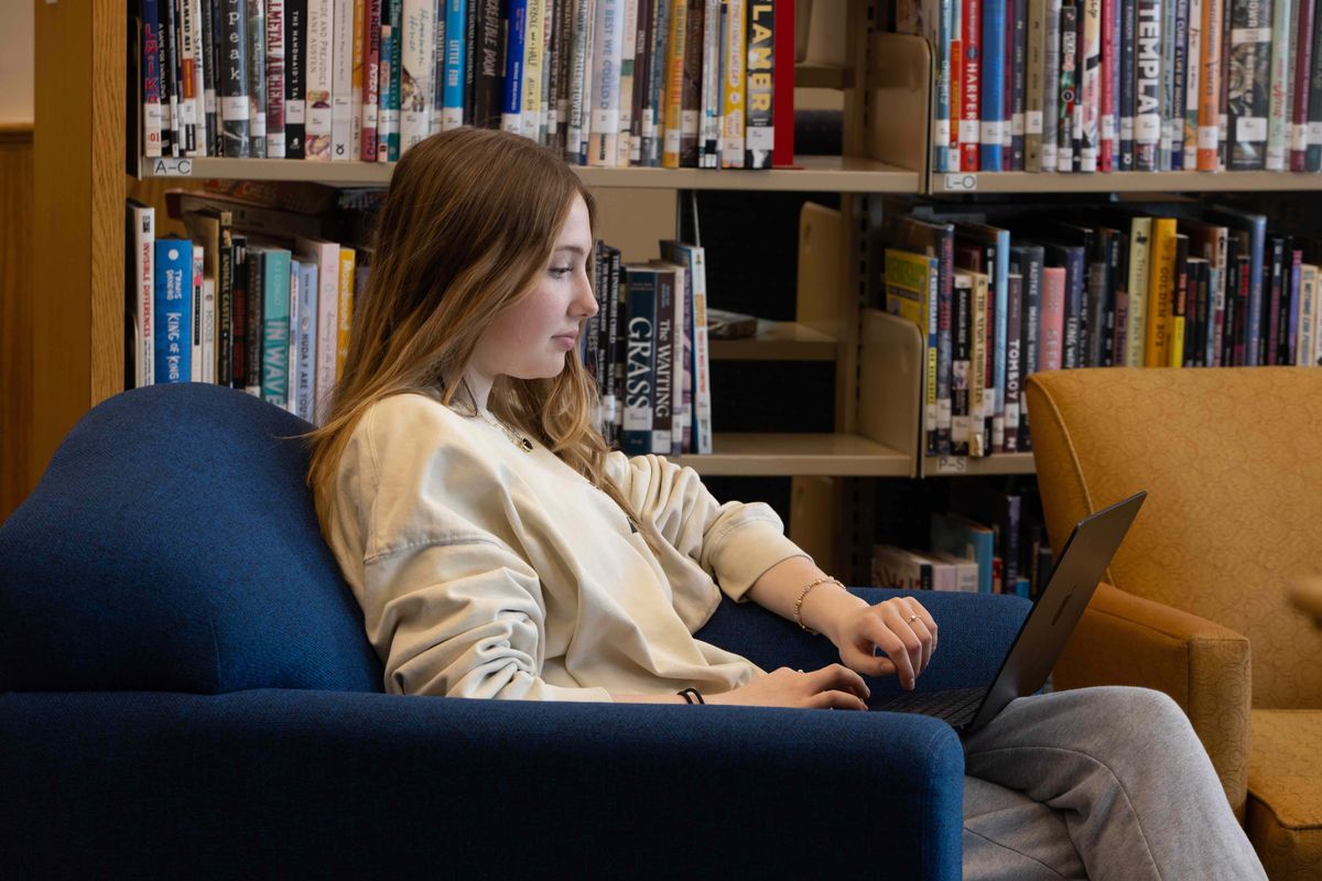 Students come to the library to study, conduct research, and to browse the collection. Comfortable seating areas, group work tables, and individual study carrels provide a variety of study options for students; the expansive view outside the window offers inspiration.