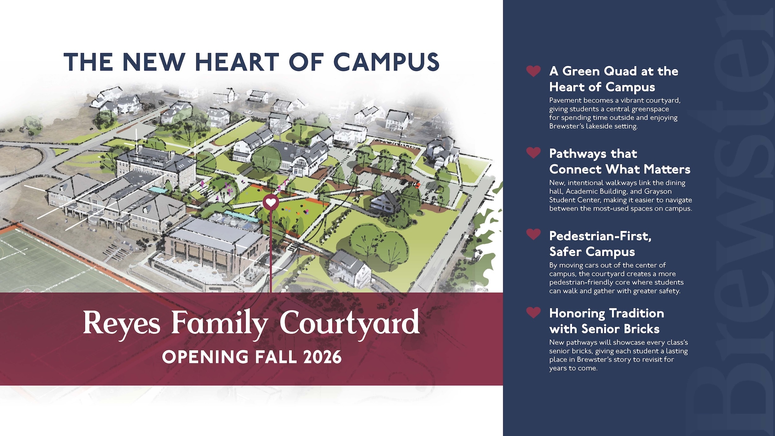 “This project is about bringing clarity and cohesion to the heart of campus,” said Head of School Kristy Kerin. “The Reyes Family Courtyard will enhance safety, improve wayfinding, and create a beautiful, shared space where students naturally gather. It is a meaningful next step in Brewster’s thoughtful evolution.”