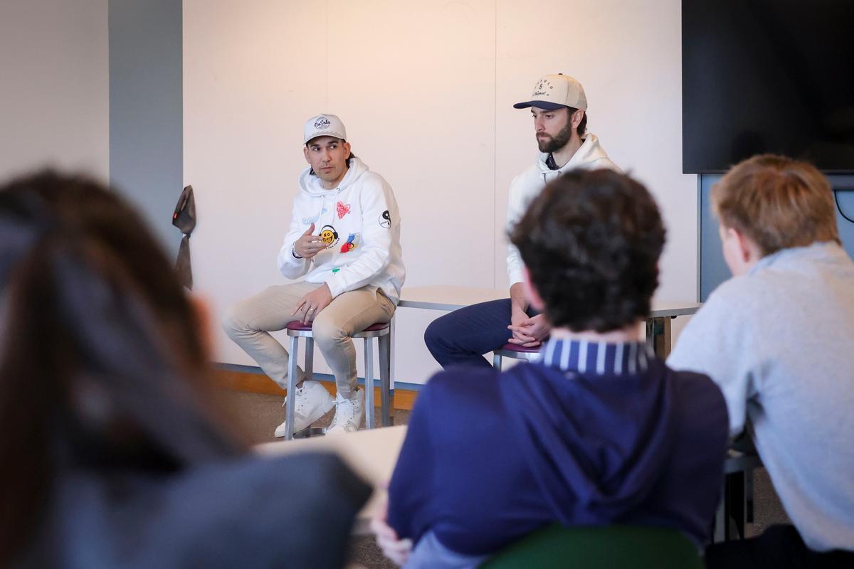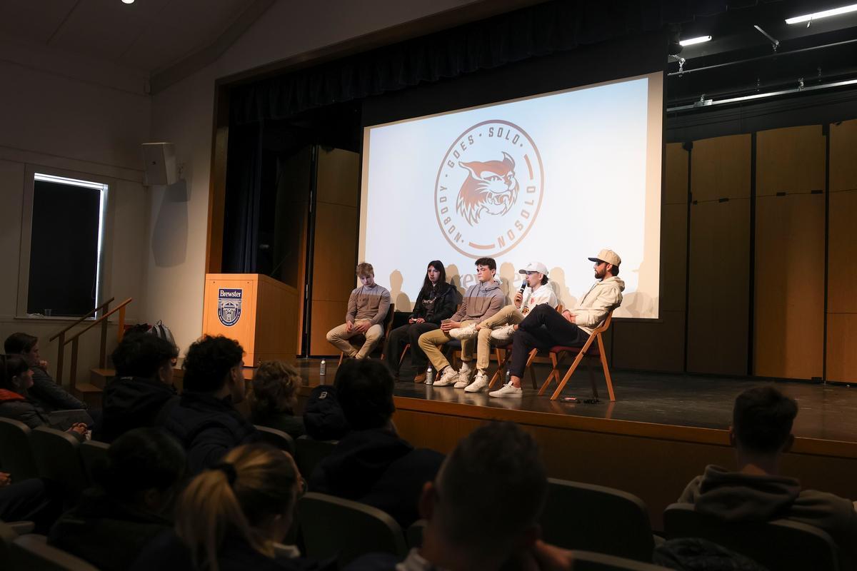 For Brewster's Mental Health Matters Club, the connection to McNamara’s experience and NOSOLO’s mission was immediate. The idea to bring the brand to campus was first raised in the fall, and the active club, which meets one to two times a week, ran with it. Members Luke Smolan '26 and Max Rusov '26 jumped on an initial Zoom call with McNamara and Toracinta to get things moving. Together, they decided a Morning Meeting Q&A was the right format. From that first conversation to the morning itself, the students drove the event from start to finish.