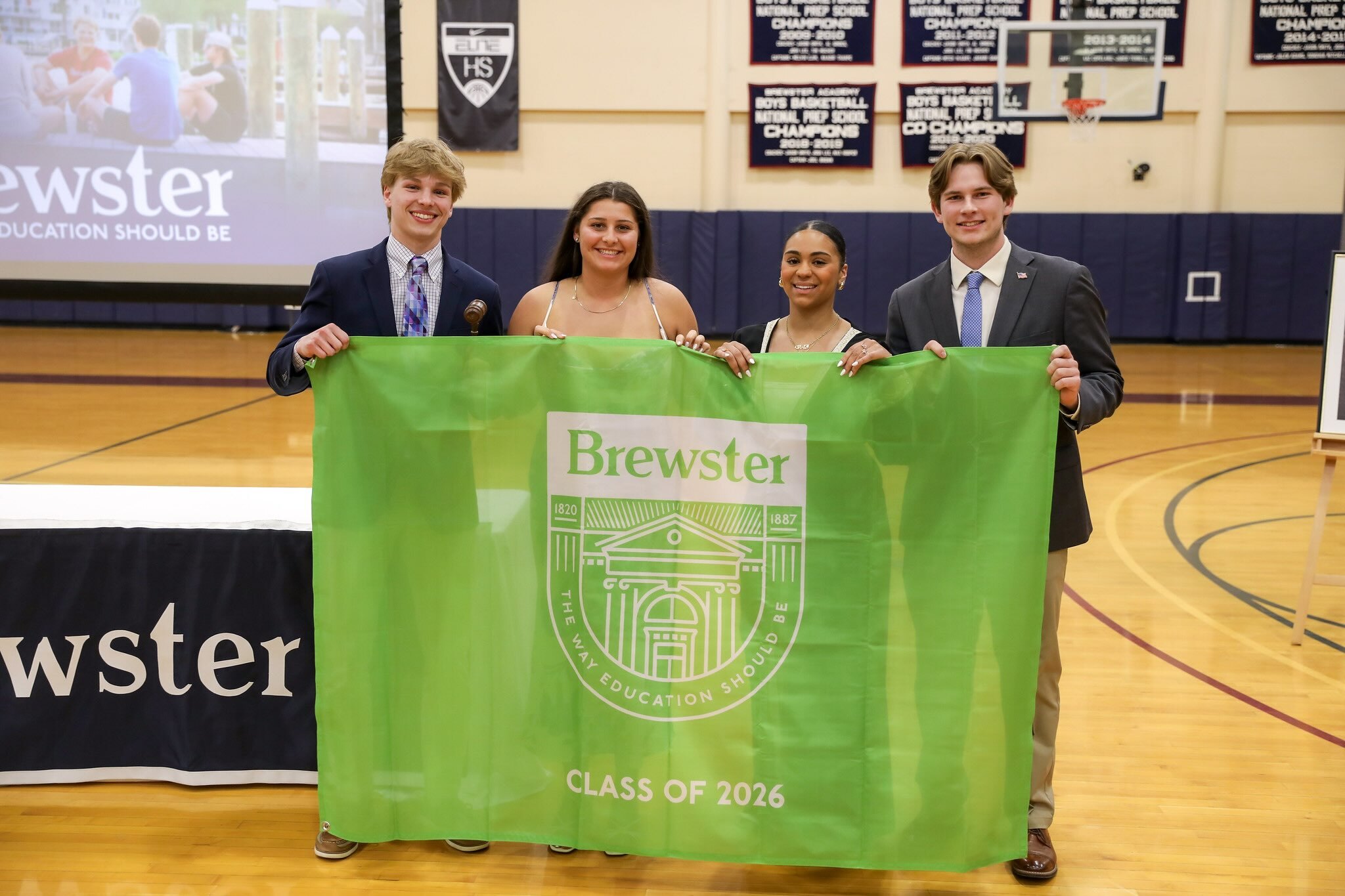 Toward the end of the ceremony, the 2025 prefects (Aya Brown and Luce Colcord) passed the gavel to the freshly announced 2026 prefects (Luke Smolan and Will Brochu), and the Class of 2025 flag (in class colors light blue and yellow) is retired as the group unfurls the Class of 2026 flag in their chosen colors of green and silver.