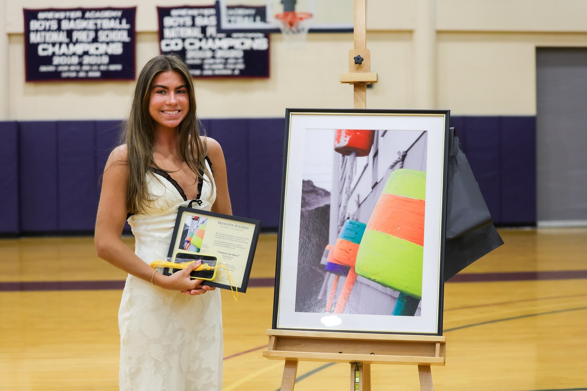 Another special moment was the announcement of this year’s inductee into the Brewster Arts Gallery of Excellence. Department Chair Liz Baker McClain announced, “The artist we highlight today used digital techniques to create a truly unique vision of her work by removing color from certain parts of the photograph…This technique of isolated color helps the artist show their vision of what was important to them when looking through the lens. For her exceptional artistry and truly creative process in editing, this year’s winner and inductee into the Brewster Gallery of Excellence is Elsa Pueschel for her work ‘Isolated Color Buoys’.”